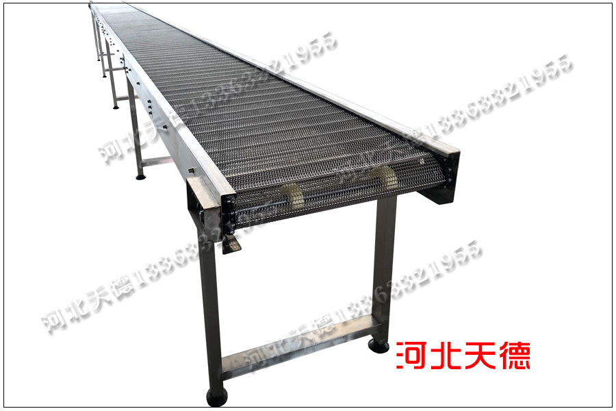 這臺輸送機的總長度為8米,總寬度為60公分,高度為70公分,不銹鋼304材質。采用鏈條輸送帶輸送,輸送帶寬度為55公分,長度為16.5米,鏈條節距為38.1毫米,桿直徑為8毫米,間距為150毫米左右。絲徑為1.8毫米,孔徑為15*20毫米。采用耐高溫不銹鋼304材質。